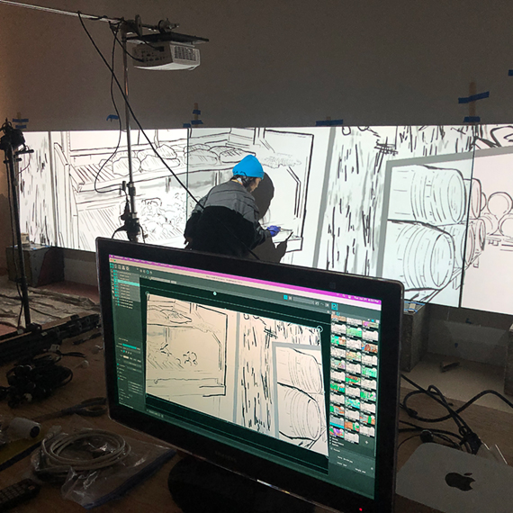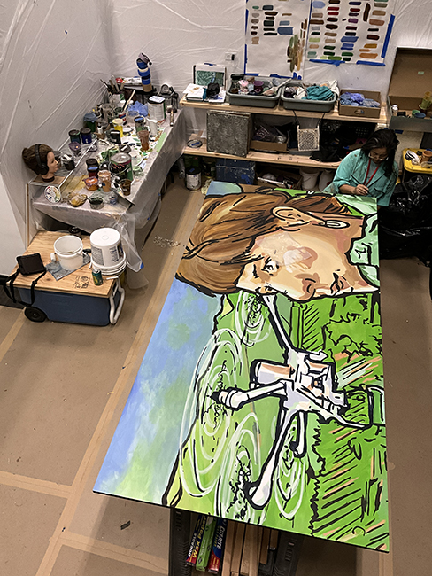 The Housing Authority of Santa Barbara kindly gave us a place to work on State Street in Santa Barbara. In our new workspace, we prepped and primed 16 marine-grade pieces of 4’x 8′ plywood, then sectioned Ricky’s image into 16 parts and projection-mapped them onto the panels. Using Disney-grade materials, we began to paint.